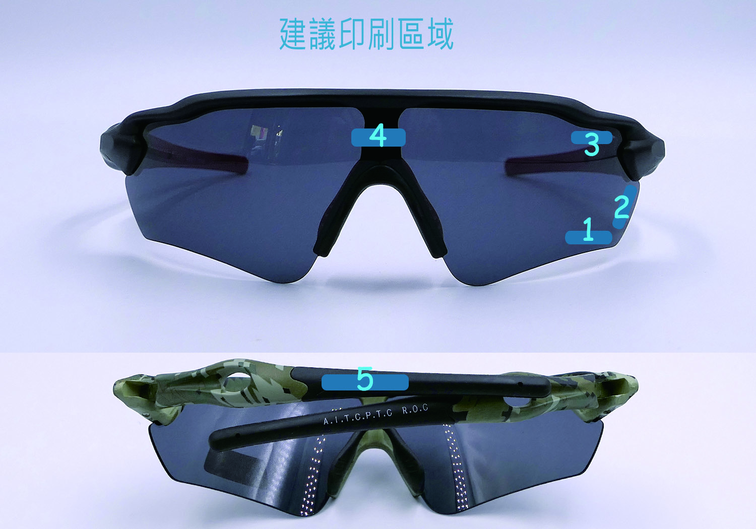 以下提供此款运动眼镜适合制印字的区域,分别有1~5,五个区域,当然印字的区域、