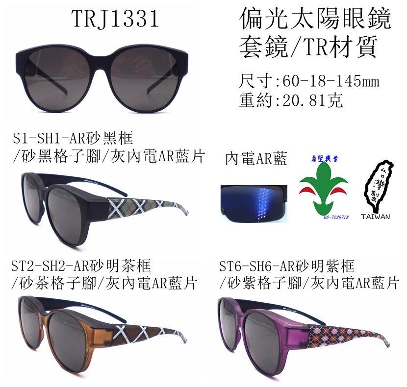 |  *型号:TRJ1331   *种类:套镜偏光太阳眼镜   *产地:台湾台南市   *颜色参考:请参考下图(数量会随出货状况异动,下单前请先确认数量)   *材质:   *镜架-PC耐冲击(採用韩国LG Chemical之PC工程塑胶)。   *镜片-TAC偏光镜片(採用德国偏光膜)。   *油漆:使用符合欧盟REACH认证规定之油漆。   *鼻垫、脚垫:无。   *全镜通过CNS15067检验,有效阻挡紫外线及反射眩光。  |