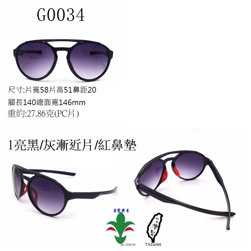 新产品:运动太阳眼镜.休闲太阳眼镜.宝丽来镜片.全框款.有鼻垫. 骑车、跑步等各式休闲运动皆适合.台湾制造. G0034为鼎坚兴业股份有限公司于2021/10/28上市产品