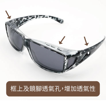 ![]() 2. 两边侧边有镜片,可增加配戴视野;框上及镜脚有透气孔,可增加透气性,降低镜片起雾机率