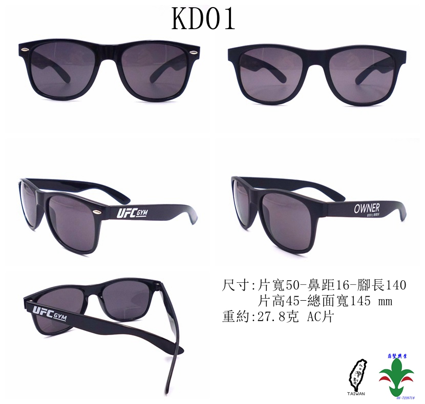 |  *型号:KD01   *种类:休闲偏光太阳眼镜   *产地:台湾台南市   *颜色参考:请参考下图(数量会随出货状况异动,下单前请先确认数量)   *材质:   *镜架-PC耐冲击(採用韩国LG Chemical之PC工程塑胶)。   *镜片-TAC偏光镜片(採用德国偏光膜)。   *油漆:使用符合欧盟REACH认证规定之油漆。   *鼻垫、脚垫:防滑橡胶。   *全镜通过CNS15067检验,有效阻挡紫外线及反射眩光。  |