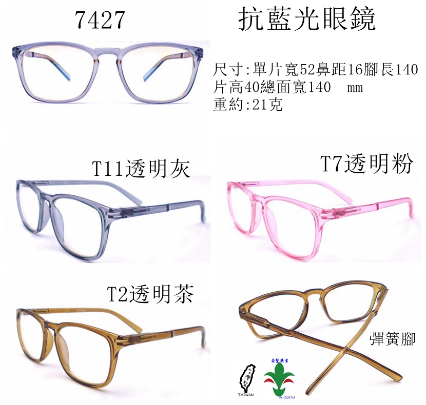 新产品:抗蓝光眼镜,成人滤蓝光眼镜,弹簧脚镜框抗蓝光眼镜,有效过滤蓝光,可阻挡紫外线方形镜片,台湾制 7427为鼎坚兴业股份有限公司于2021/07/12上市产品