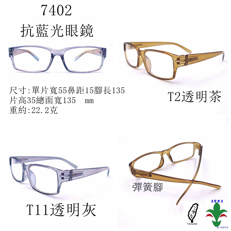 新产品:抗蓝光眼镜,成人滤蓝光眼镜,弹簧脚镜框抗蓝光眼镜,有效过滤蓝光,可阻挡紫外线方形镜片,台湾制7402为鼎坚兴业股份有限公司于2021/07/06上市产品